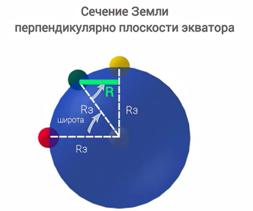 Если мы знаем широту черной точки на рисунке выше, то угол между зеленым катетом и гипотенузой прямоугольного треугольника равен этой широте. Гипотенуза - это радиус Земли. Радиус Земли известен (для неточных вычислений можно принять его 6 400 км). Зная гипотенузу и угол, можем вычислить длину зеленого катета. Если знаете тригонометрию, то этот катет равен гипотенузе, умноженной на косинус нашего угла, т.е. на косинус широты. Если не знаете тригонометрию, то можно нарисовать прямоугольный треугольник так, чтобы его гипотенуза была равна 6,4 сантиметра (уменьшили отрезок в 10 млн раз) и угол был равен той широте, про скорость на которой Вы хотите узнать (например, широта 30 градусов). И построив такой треугольник, измерить у него длину катета, аналогичного зеленому катету на рисунке выше. Затем умножайте полученное значение на 10 млн, и получите длину радиуса в сантиметрах, по которому вращается точка.