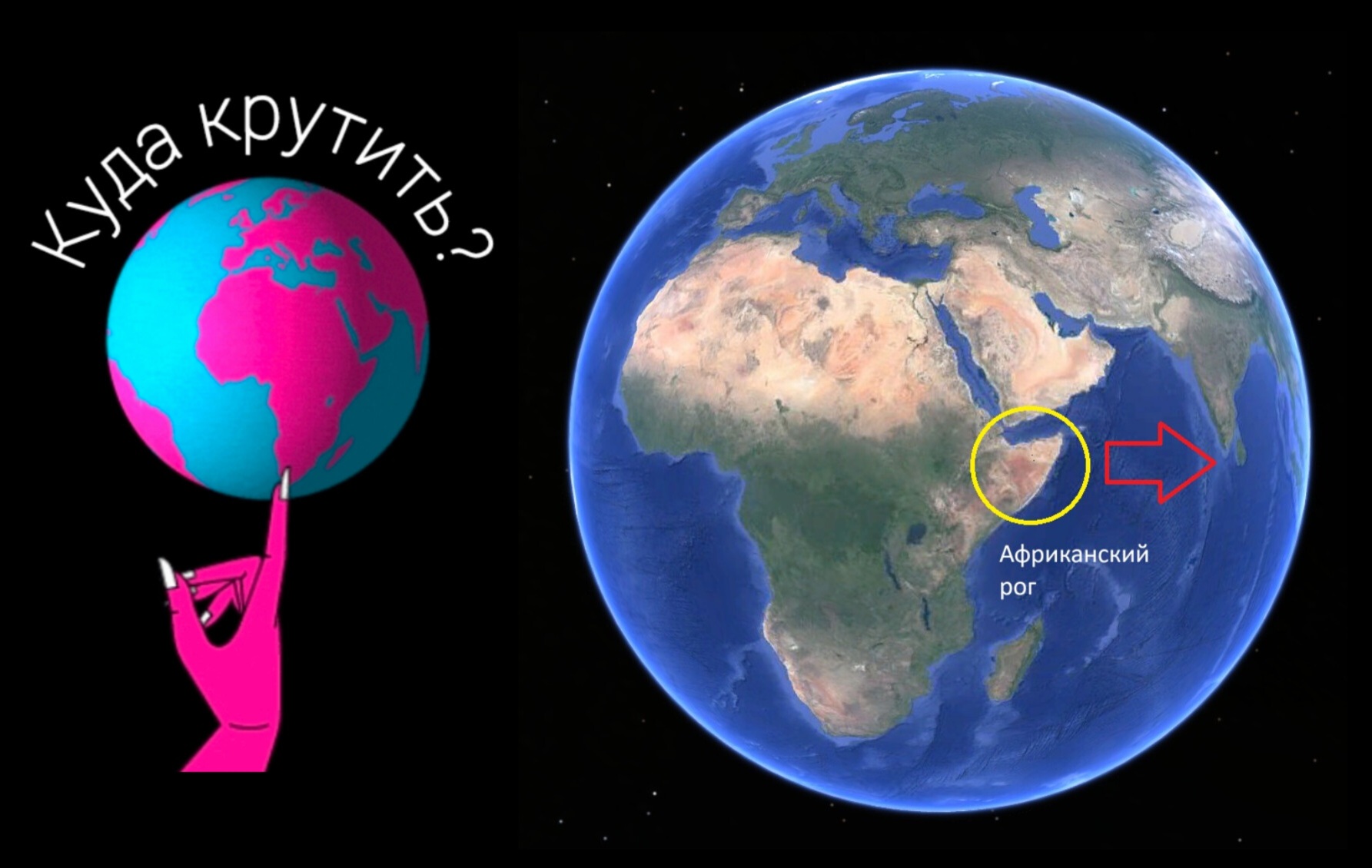 Чтобы вращать глобус правильно, нужно вращать его так, чтобы Африка двигалась "рогом вперед". Африканский рог - это полуостров Сомали.